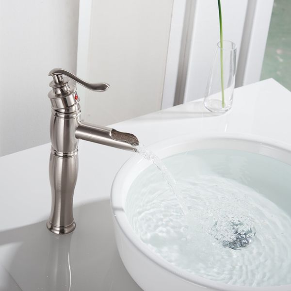 Bwe Waterfall Spout Single Handle One Hole Bathroom Vessel Sink Faucet Brushed Nickel Tall Body Matching Pop Up Drain Without Overflow Deck Mount