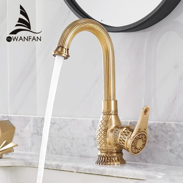 Vintage Bathroom Faucets Carved Single Handle Gooseneck Antique Brass Gold
